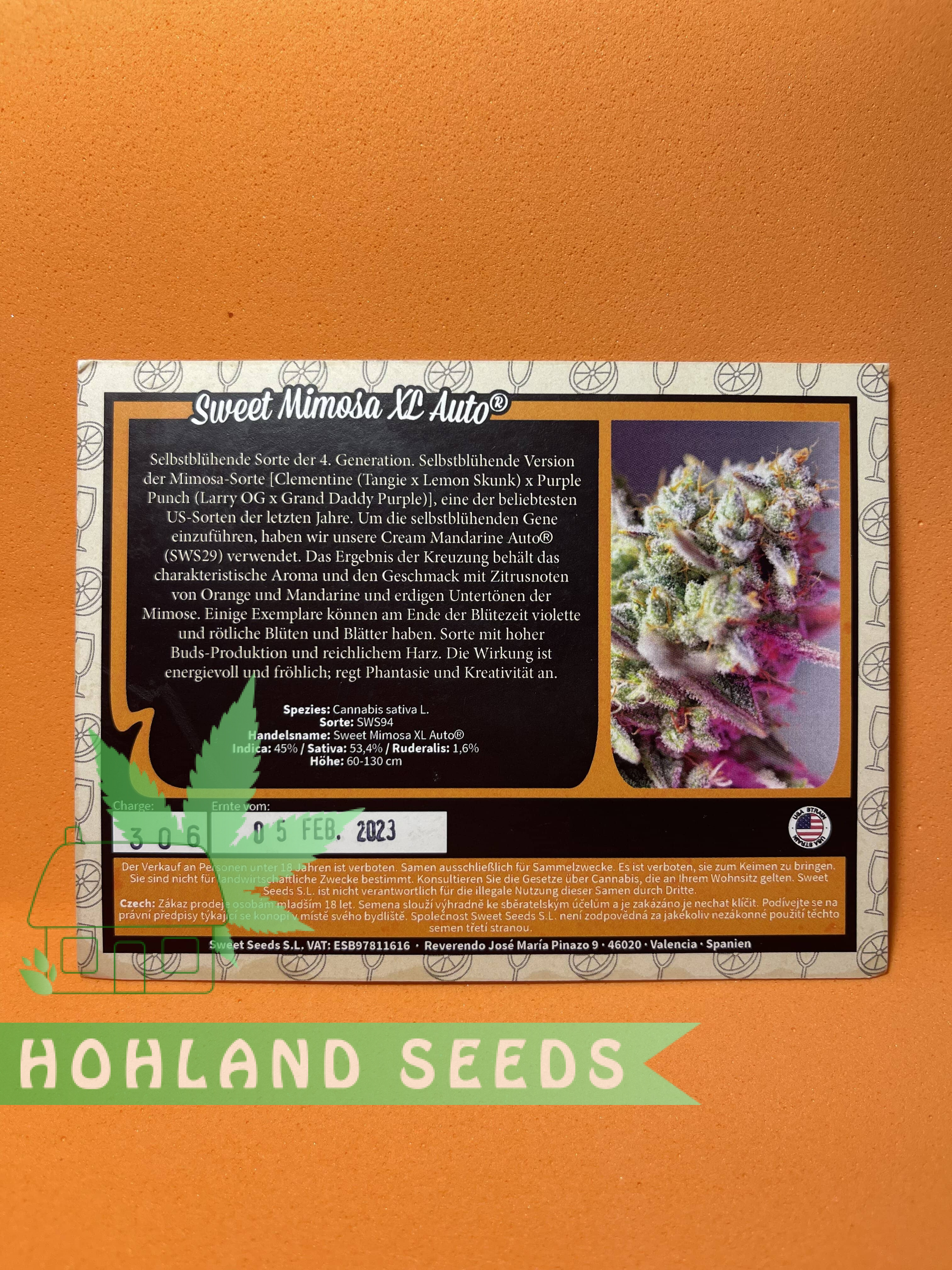 Sweet Mimosa XL Auto — это автоцветущие семена конопли знаменитого сорта Mimosa из США. Выведенный экспертами Sweet Seeds, Sweet Mimosa XL Auto сочетает в себе звездную генетику Clementine и Purple Punch. В результате получается самый мощный автоцвет с преобладанием сативы, дающий смолистые шишки со свежим цитрусовым ароматом и большим количеством ТГК 23%.