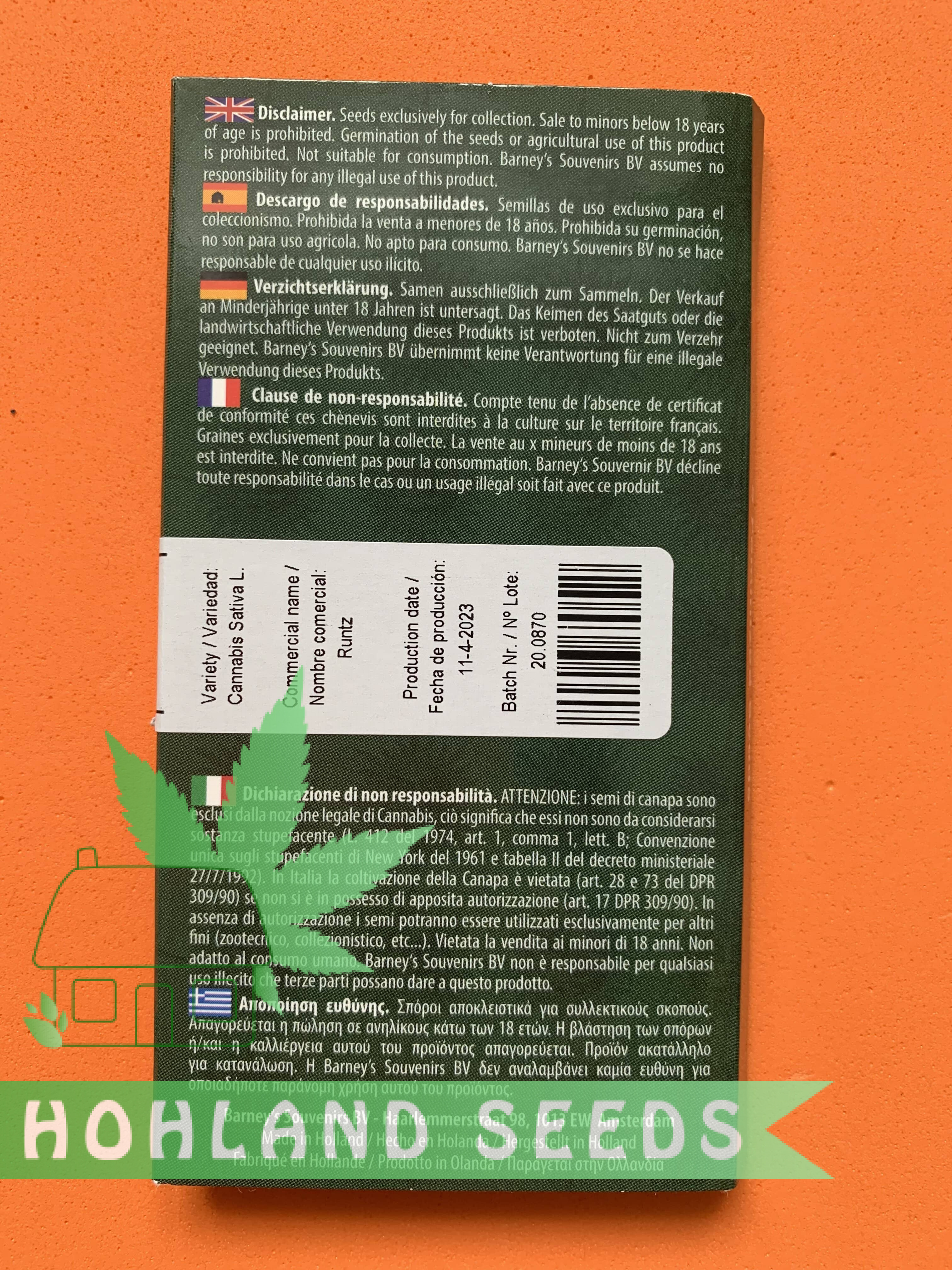 Runtz олицетворяет эффективность команды бренда Barney's Farm. Этот сорт порадует каждого высокими урожаями до 1500 грамм с растения и крепкими цветками. Растение демонстрирует великолепную структуру и превосходную плотность бутона (хотя по типу это на 50% сатива), что делает его идеальным выбором для культивации как внутри помещений, так и на открытом воздухе. Время цветения 8-9 недель