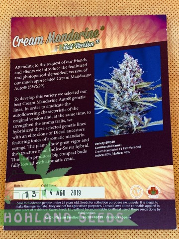 Cream Mandarine F1 Fast Version от Sweet Seeds – феминизированный гибрид автоцветущего сорта Cream Mandarine. Доминирует индика – 60 процентов. От родителя Крем Мандарин Ф1 Фаст Версион отличается структурой куста, он стал значительно ниже, но куда кряжистей, распространившись в ширину. Выращенный в условиях закрытого помещения, куст не поднимется выше 130 сантиметров, в аутдоре он может оказать выше немногим более, чем в два раза. Повышенной урожайности испанские бридеры добились примешиванием генетики Diesel.
