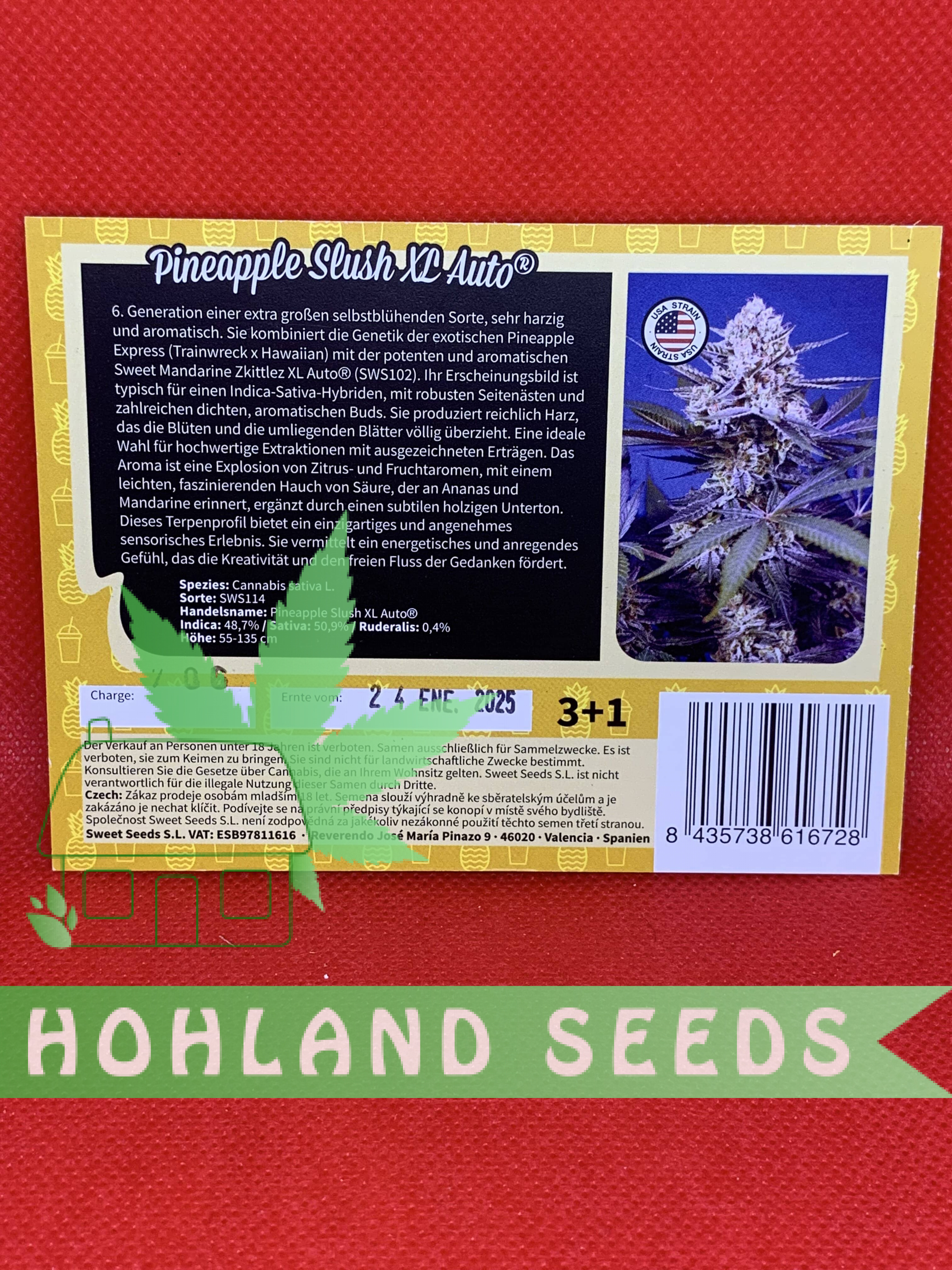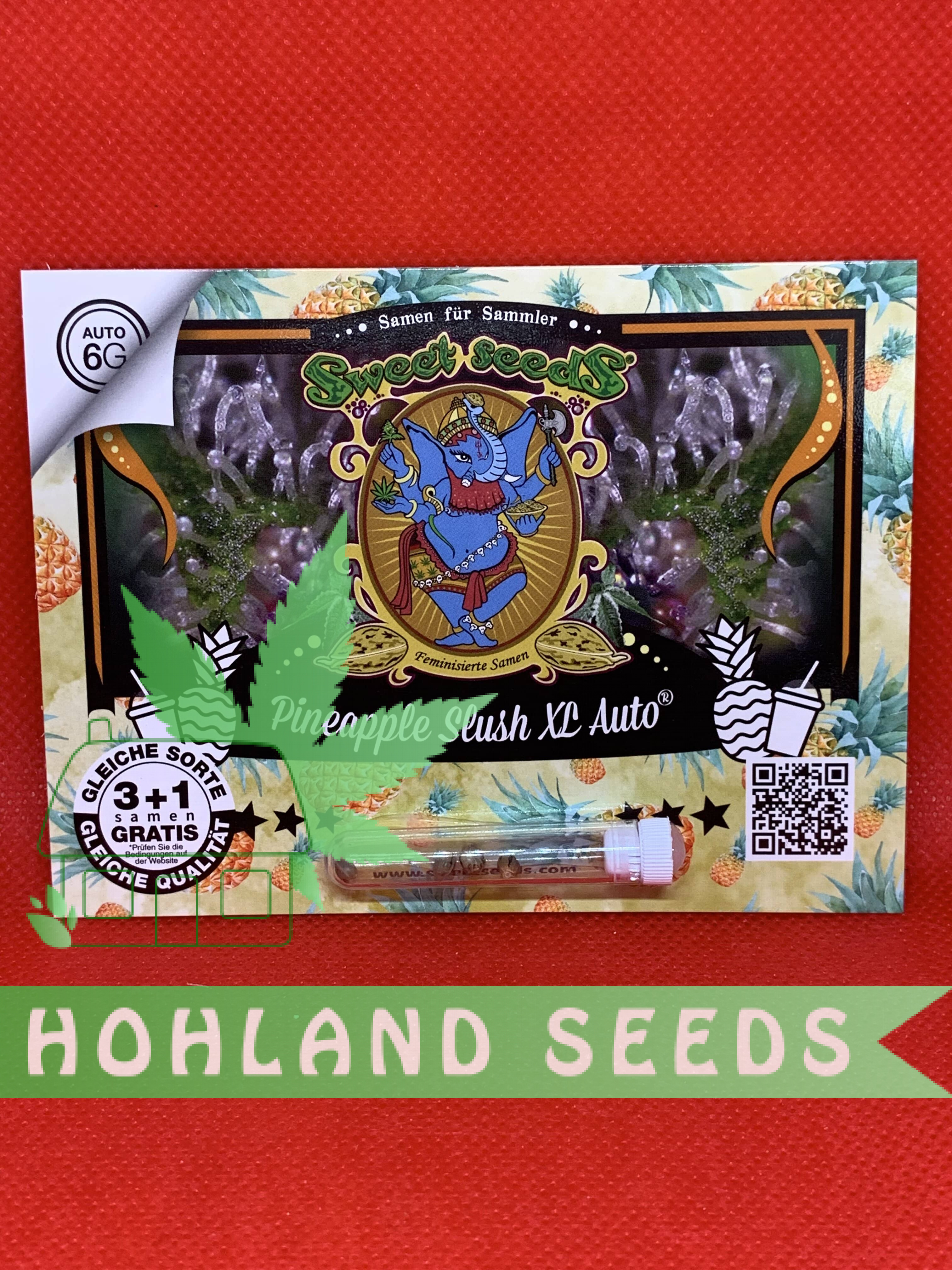 · Autoflowering Ruderalis - для создания автоцветущей версии, сорт марихуаны Pineapple Slush XL Auto был стабилизирован и скрещен с отобранной автоцветущей линией Sweet Seeds. Приставка "XL" указывает на то, что селекционеры уделили особое внимание усилению вегетативной мощи и конечной урожайности, что делает этот автоцвет конкурентом многим феминизированным автоцветущим сортам.