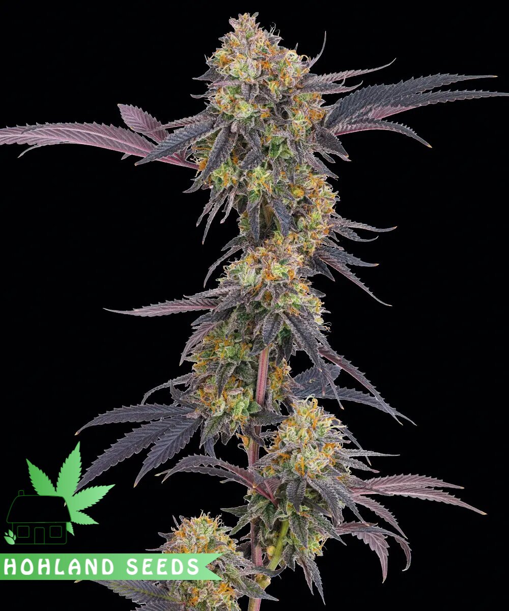 · Соцветия (шишки): Плотные, смолистые, часто имеют вытянутую, коническую форму, характерную для сативовых гибридов. Их главная особенность — цвет. В зависимости от фенотипа и условий выращивания, шишки могут демонстрировать потрясающую палитру от глубокого фиолетового и темно-синего до почти чёрного, с контрастными оранжевыми или рыжими пестиками.